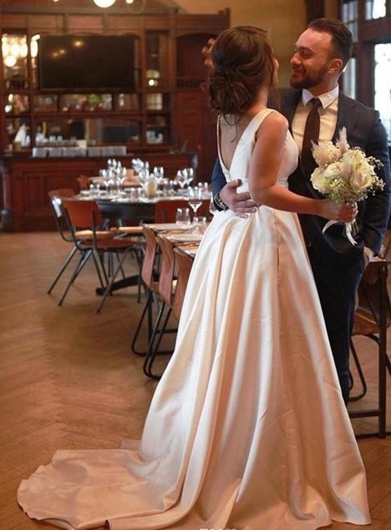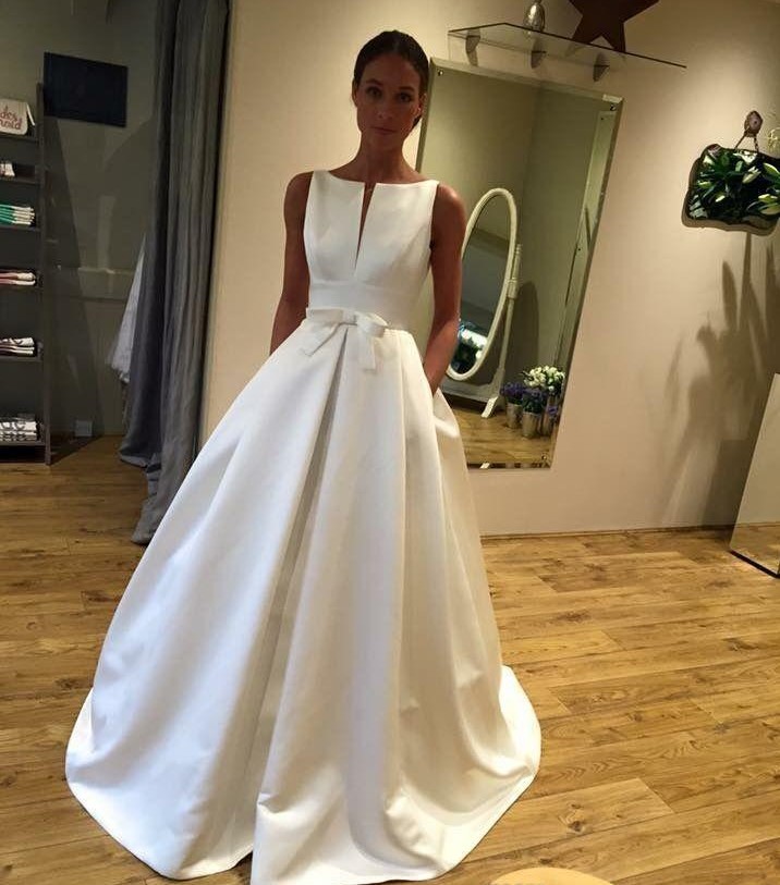 Cheap Simple A Line Wedding Dresses Bateau Sleeveless Keyhole Backless Bow Sweep Train Satin Country African Bridal Gowns