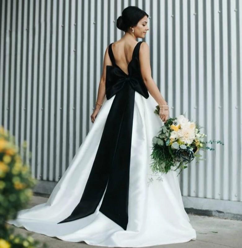 Simple Black and White Gothic Wedding Dresses V Backless Big Bows A line Ruched Satin Wedding Bridal Gowns