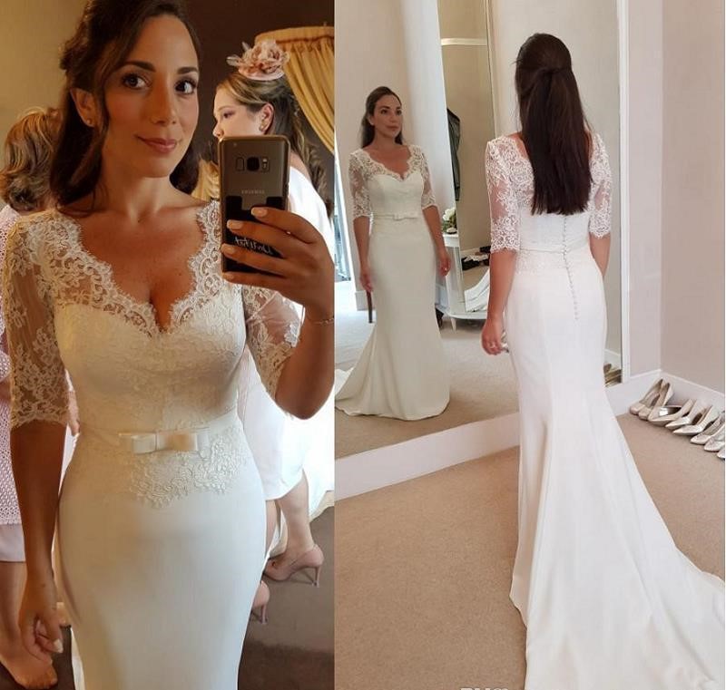 Simple Designed Vintage Satin Lace Mermaid Wedding Dresses Appliqued Sheer Half Sleeve Bow Belt Sweep Train Bride Wedding Gowns