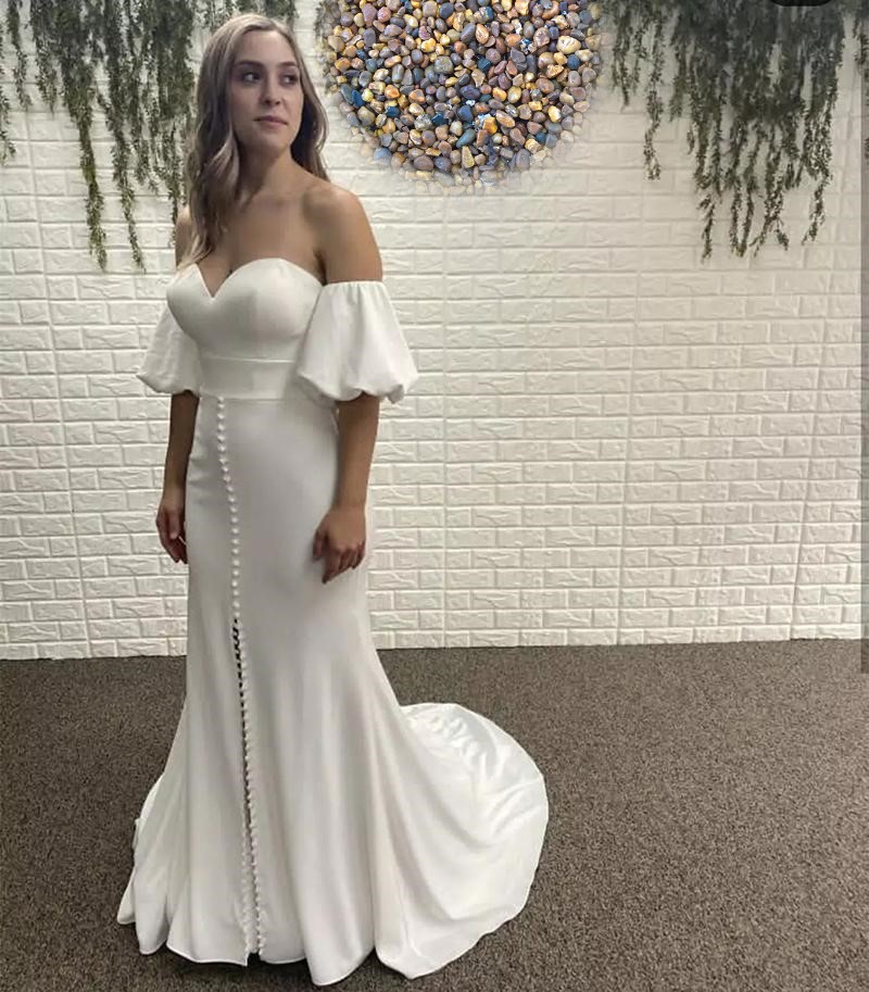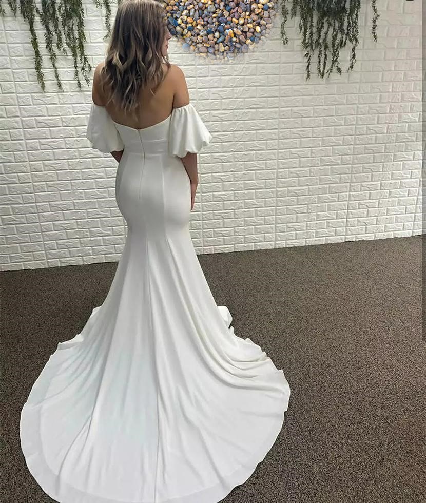 Simple Mernaid Wedding Dress Satin Sweep Train Puff Sleeve Short Bridal Gowns Unique Design Speical Backless Bridal Gowns