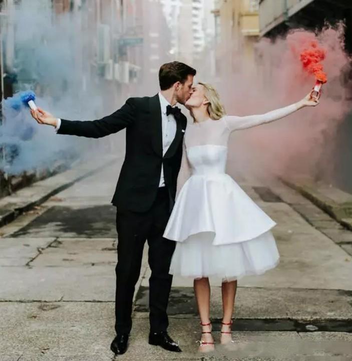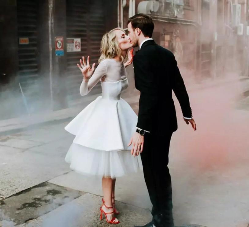 Vintage Short Wedding Dresses Knee Length Long Sleeve Sheer Neck Tulle Satin Bridal Gowns