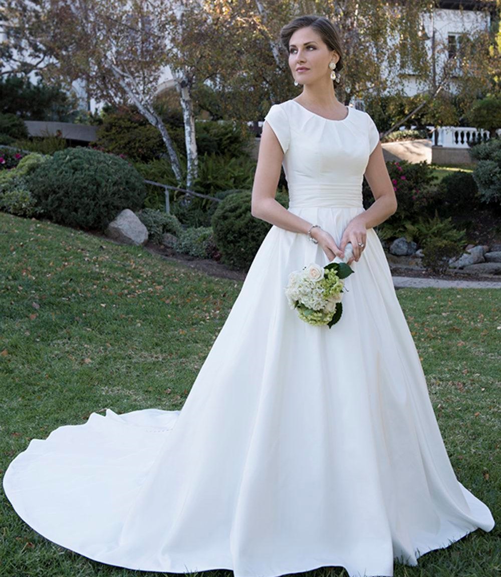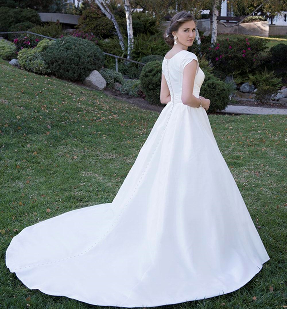 Vintage Simple Satin Modest Wedding Dresses With Cap Sleeves Puffy Buttons Back Formal Garden Country Wedding Gowns Bridal Dress