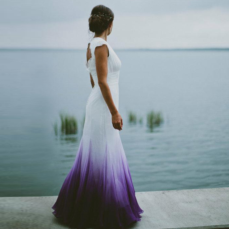 Omber Mermaid Chiffon Purple Beach Wedding Dresses Ruched Lace Accents Bridal Gowns