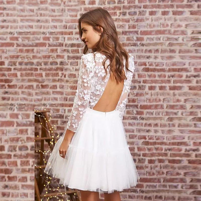 Hot Sale Lovely Short Long Sleeve Bridal Wedding Dresses Lace Jewel Neck Cut Out Back Wedding Gowns