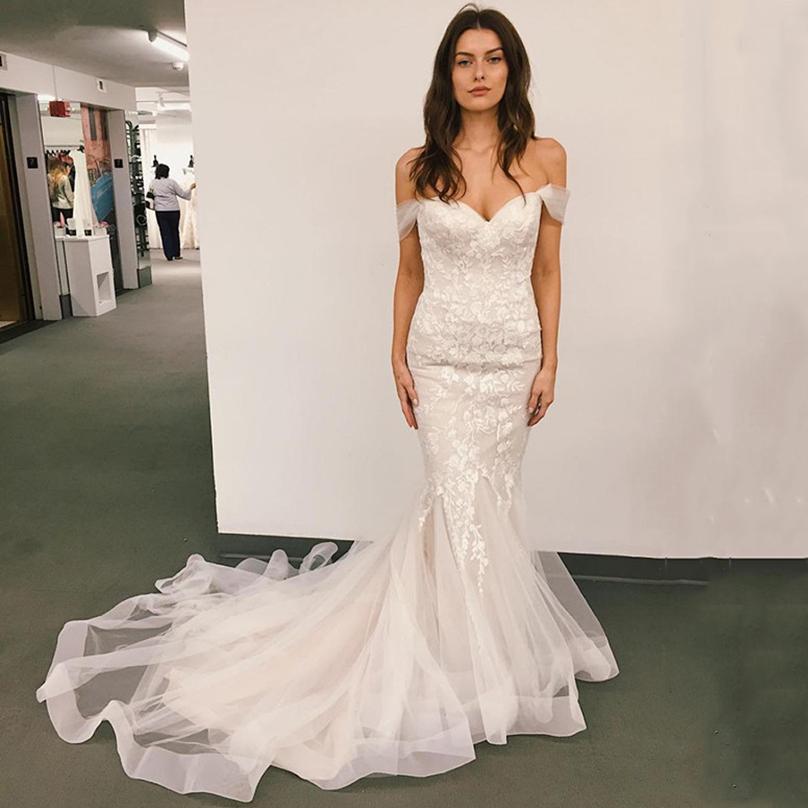 Off the Shoulder Lace Mermaid Wedding Dresses Short Sleeves Appliqued Sweep Train Tulle Lace-up Bridal Gowns
