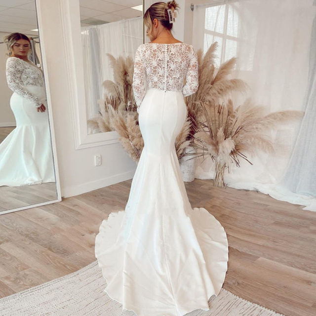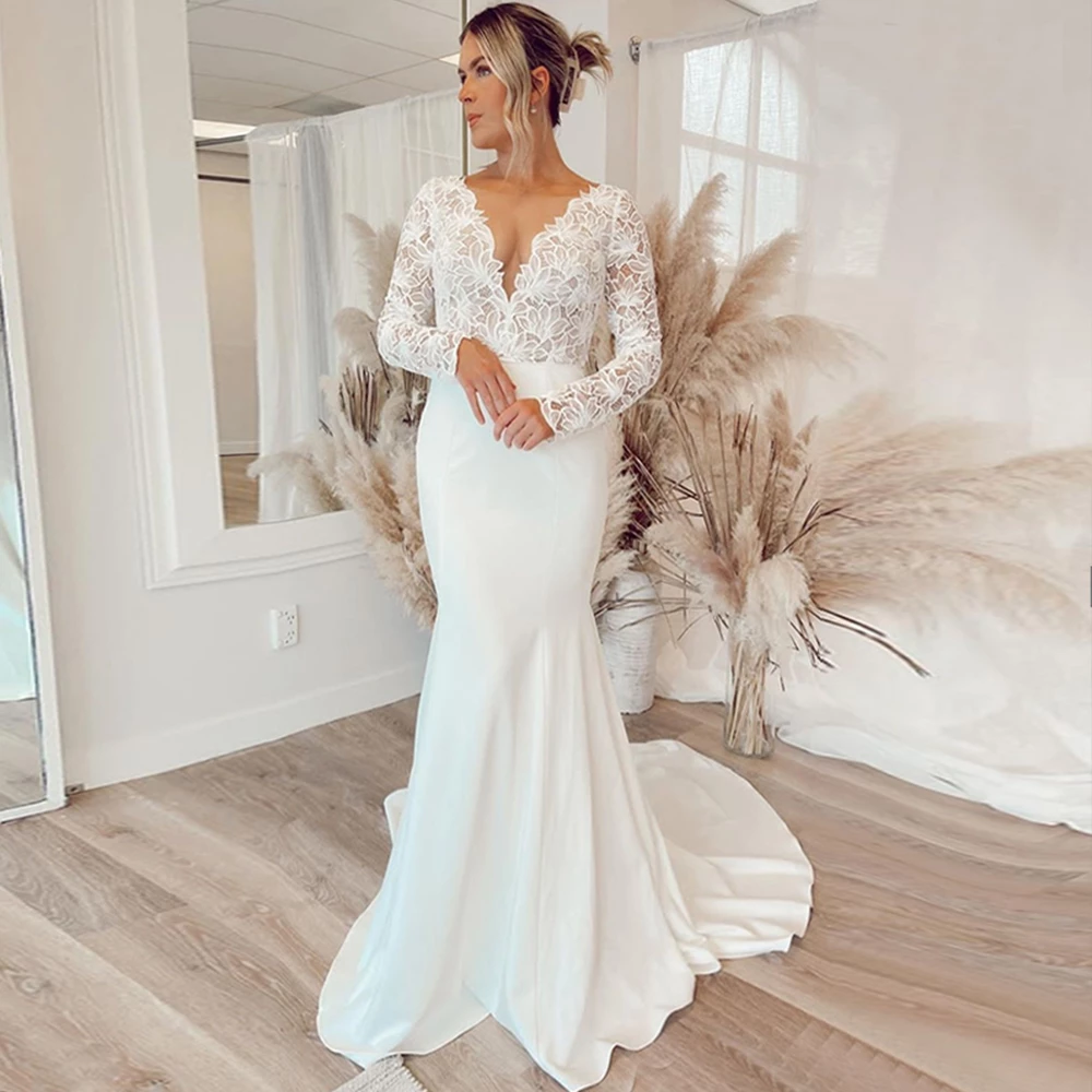Charming Simple Mermaid Wedding Dress Lace Top V Neck Long Sleeves Bridal GownsLong Sleeve A Line Bridal Gowns