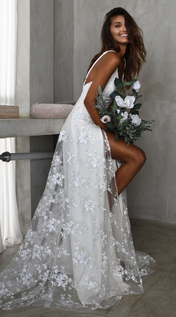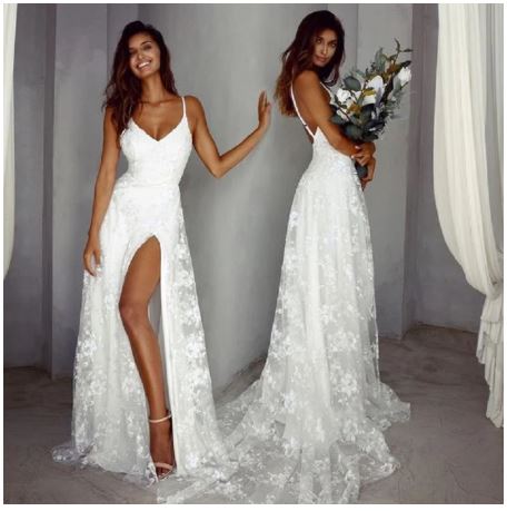 Lace Spaghetti Straps High Slit Wedding Dress Boho A-Line V-Neck Beach Bride Dresses