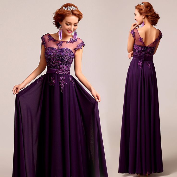 Cap Sleeves A line Scoop Lace Appliques Purple Chiffon Long Evening Dress