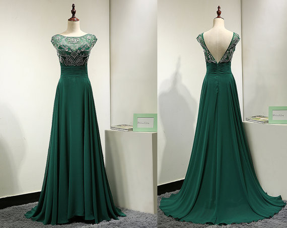 Cap Sleeves High Neck Green Chiffon Prom Dresses,Back V Rhinestones Prom Gowns
