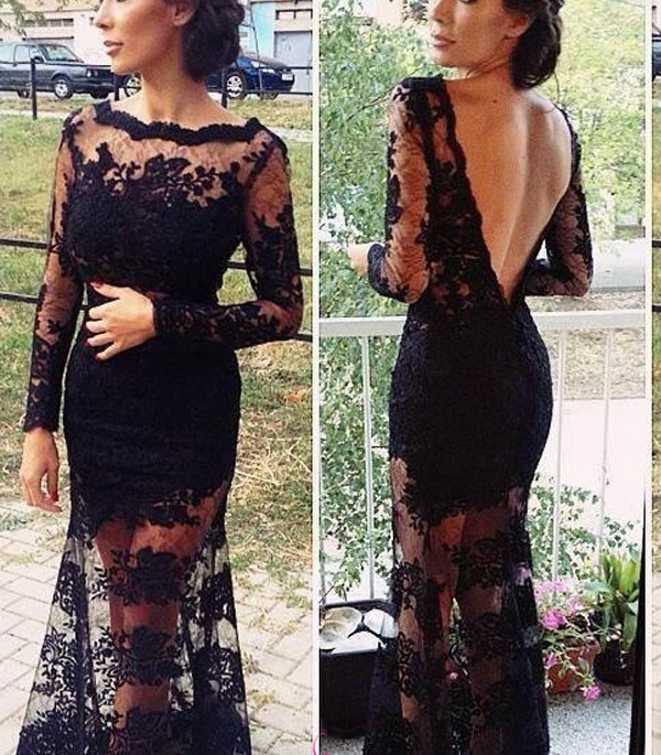 Mermaid High Neck Long Sleeves Backless Lace Black Prom Dresses