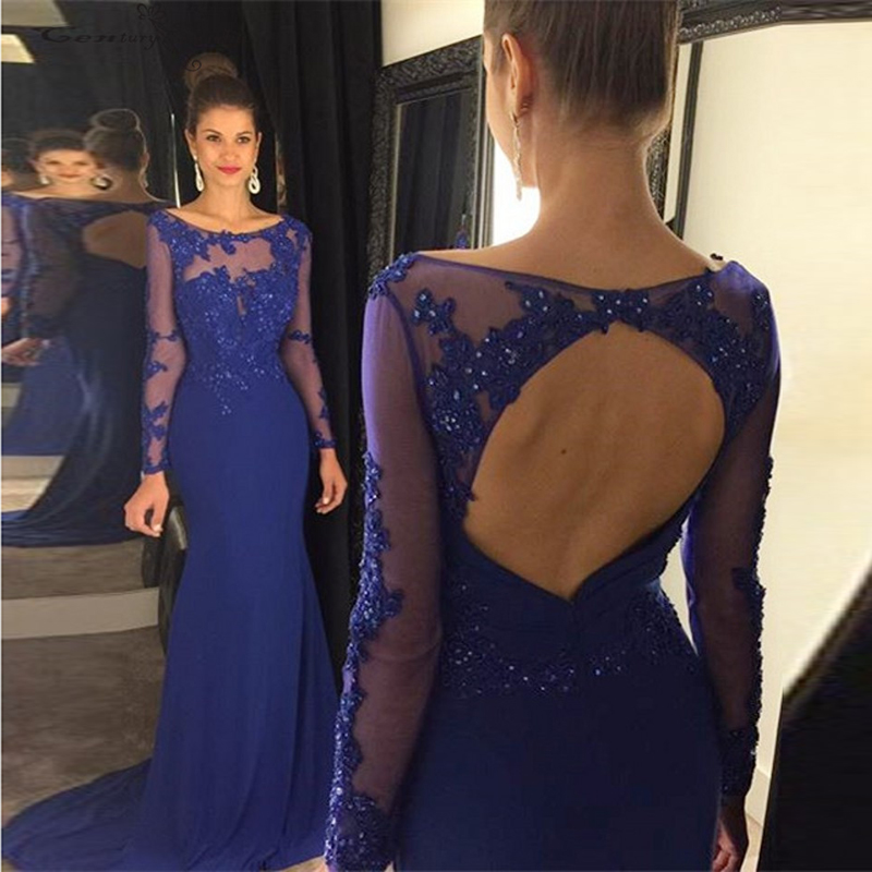 Royal Blue Long Sleeves Evening Dresses Open Back Lace Appliques Beaded Formal Party Gowns Prom Dresses