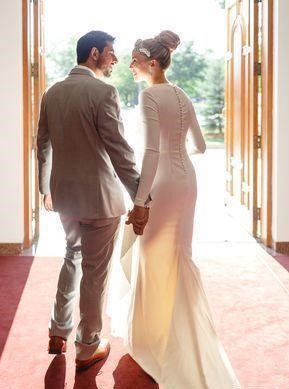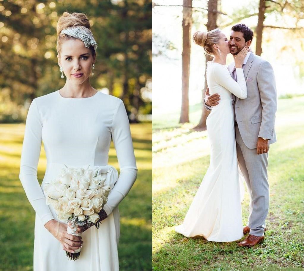 elegant Satin Mermaid Wedding Dresses Jewel Neck Long Sleeve Country Bridal Dress Sheath Covered Button Back Simple Beach Bridal Gowns