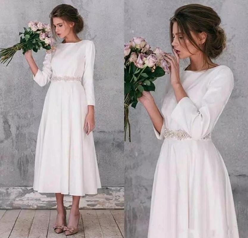 New Tea Length Short Wedding Dresses Bohemia Summer Beach A-Line Long Sleeves Bridal Gowns Cheap Simple Satin Wedding Dress