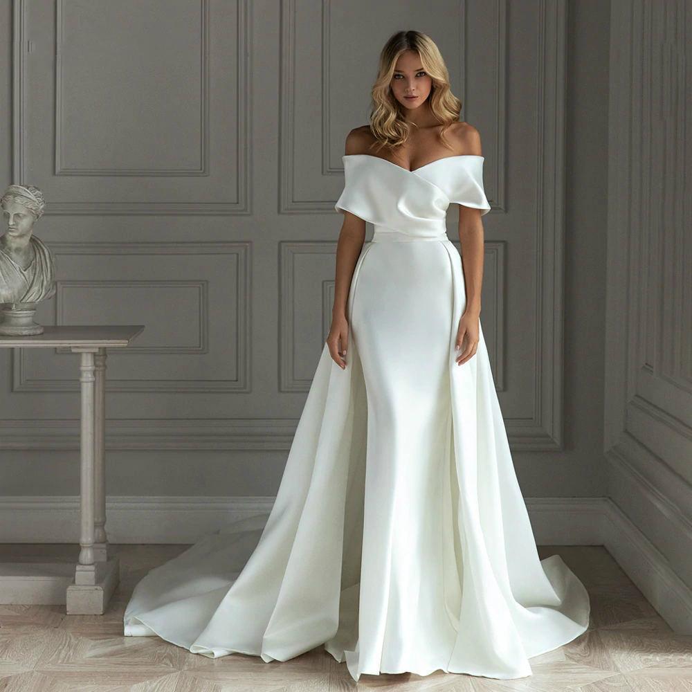 Simple Satin Mermaid Wedding Dresses With Detachable Train Off Shoulder Sweep Train Bride Gowns Garden Wedding Dress