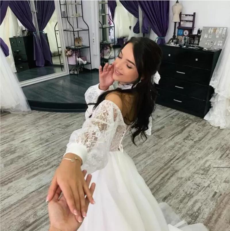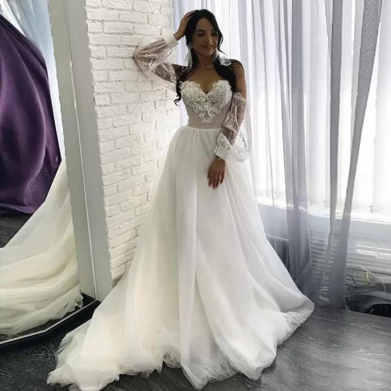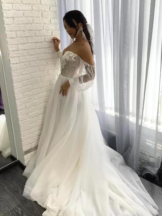 Lace Long Puff Sleeves Wedding Dresses Bridal Gowns Off the Shoulder Sweetheart Appliques Tulle A Line Bohemian
