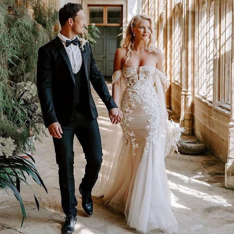 Off Shoulder Lace Mermaid Wedding Dresses Strapless Bridal Gowns Appliqued Sweep Train Tulle Bohemian