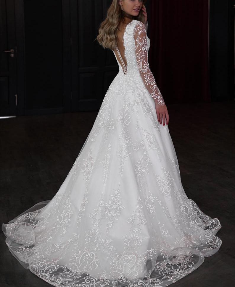 Long Sleeves A Line Wedding Dress Vintage Bohemian Lace Sexy V Neck Sweep Train Bridal Gowns