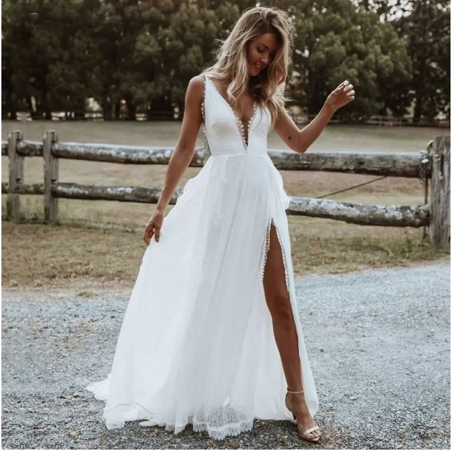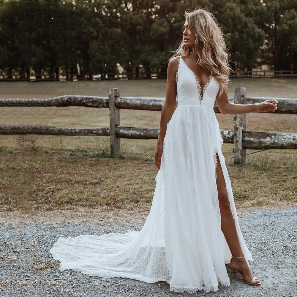Boho Beach Lace Wedding Dresses Sexy Side High Split Spaghetti Straps Long Bridal Gowns Deep V-neck Bohemian Bride Dress
