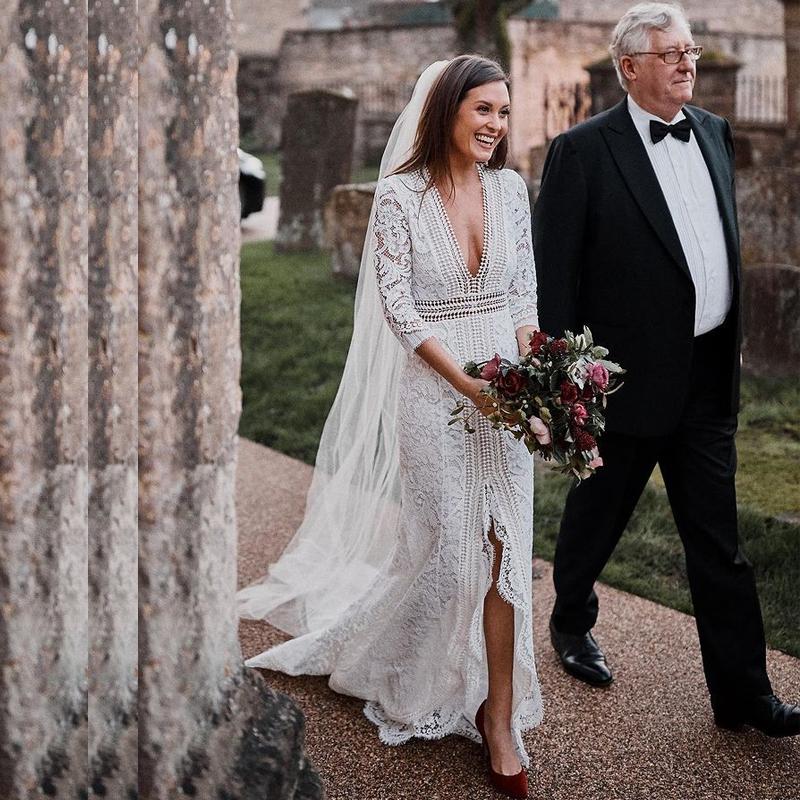 Graceful Full Lace Front Split Wedding Dresses V Neck Three Quarter Sleeve Mermaid Bridal Dress Garden Bohemian Wedding Gowns