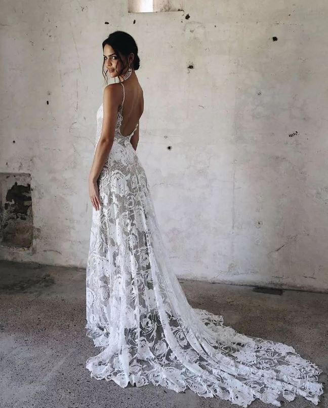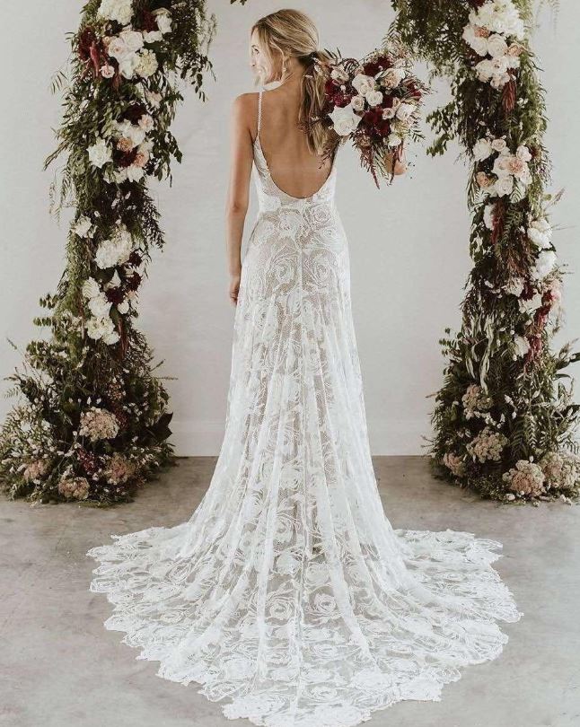 Romantic France Lace Boho Beach Wedding Dress Sexy Backless Spaghetti Straps Vestido de Noiva Vintage Bohemian Wedding Gown