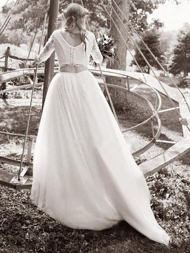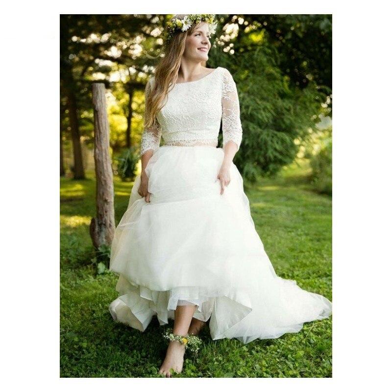 Two Pieces Boho Wedding Dresses 3/4 Long Sleeve Lace Top Tulle Skirt A Line Bridal Gowns
