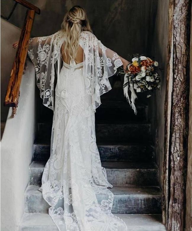 Bohemian Beach Wedding Dresses V Neck Bell Long Sleeve Lace Open Backless Boho Bridal Gowns Wedding Dress