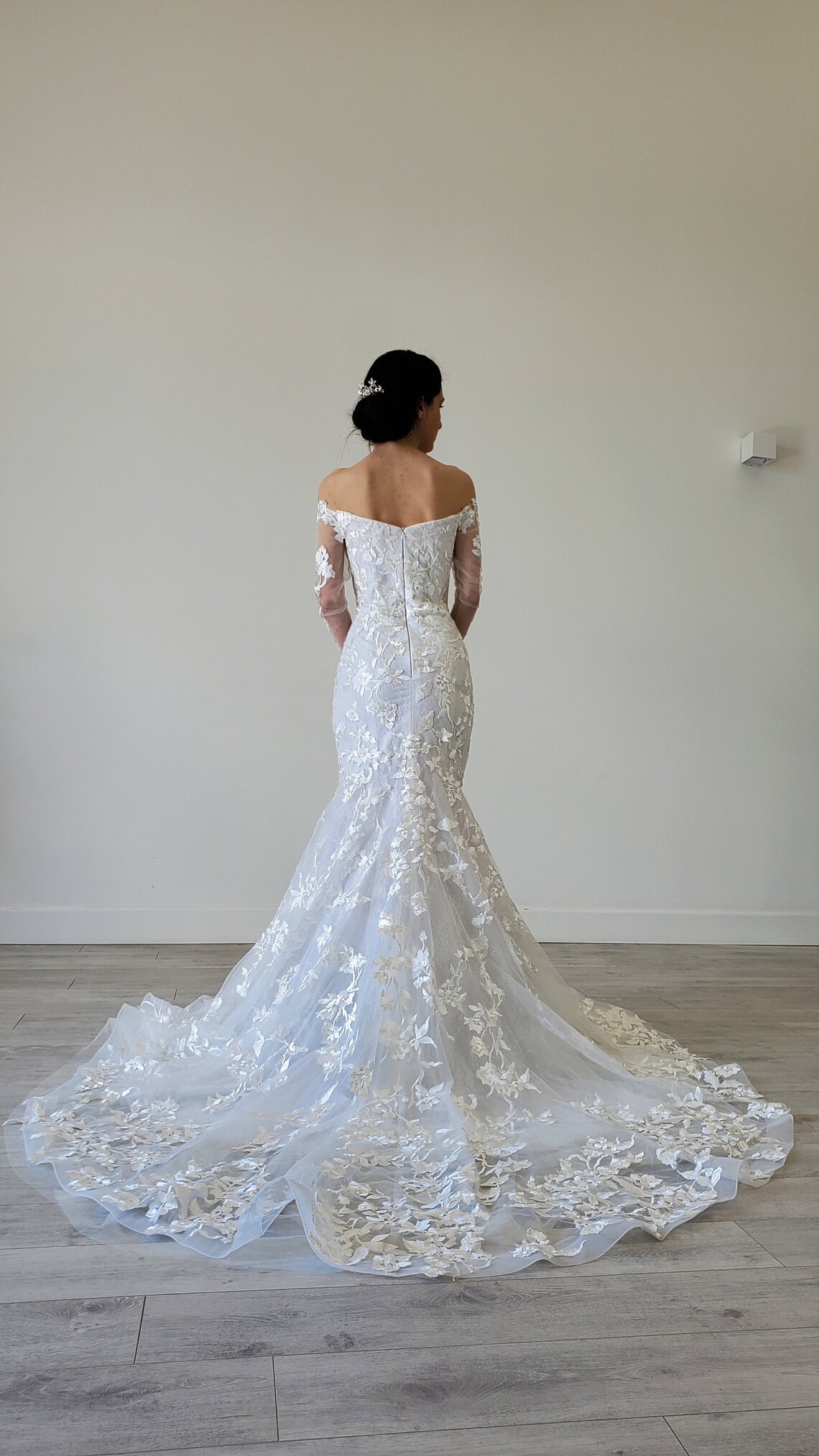 Elegant long sleeve V-neck off shoulder lace applique wedding dress