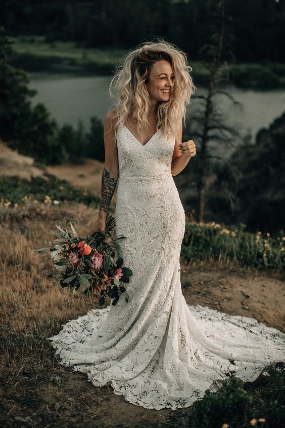 Bohemian sleeveless v-neck lace wedding dress