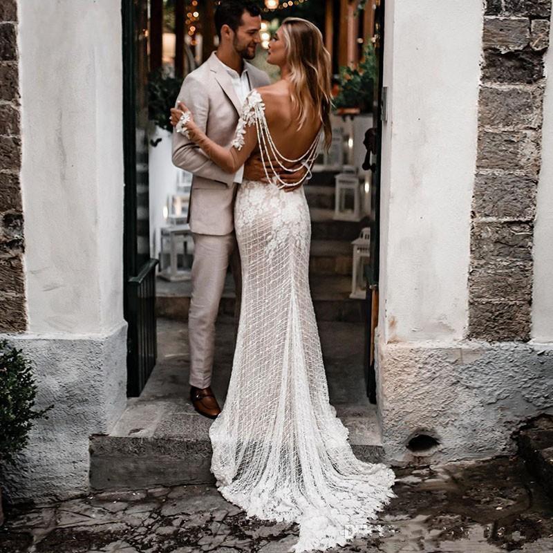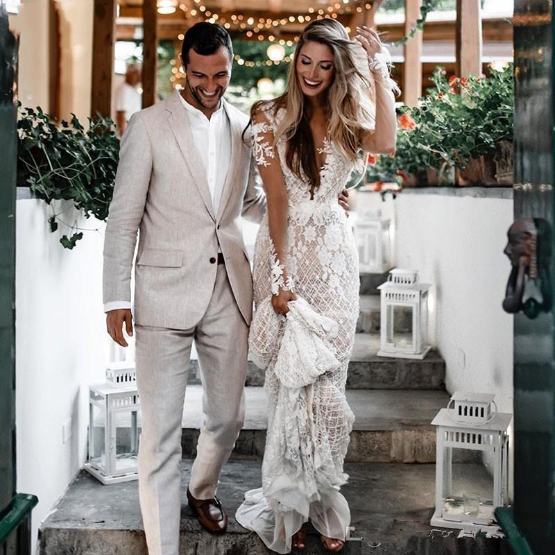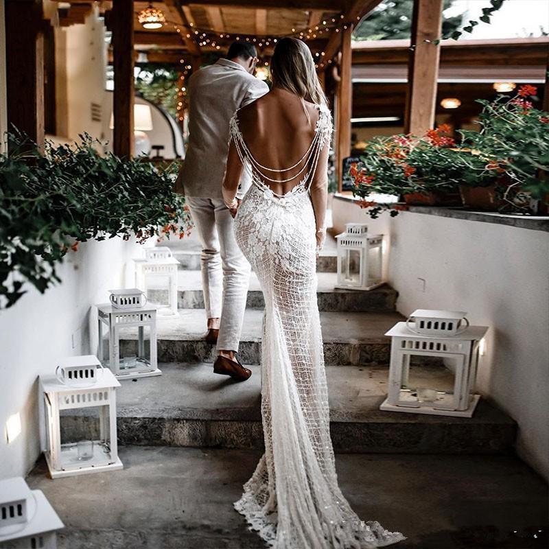 Bohemian Long Sleeve Lace Mermaid Wedding Dresses Sexy V-Neck Illusion Elegant Bridal Gowns Country Boho Wedding Dress