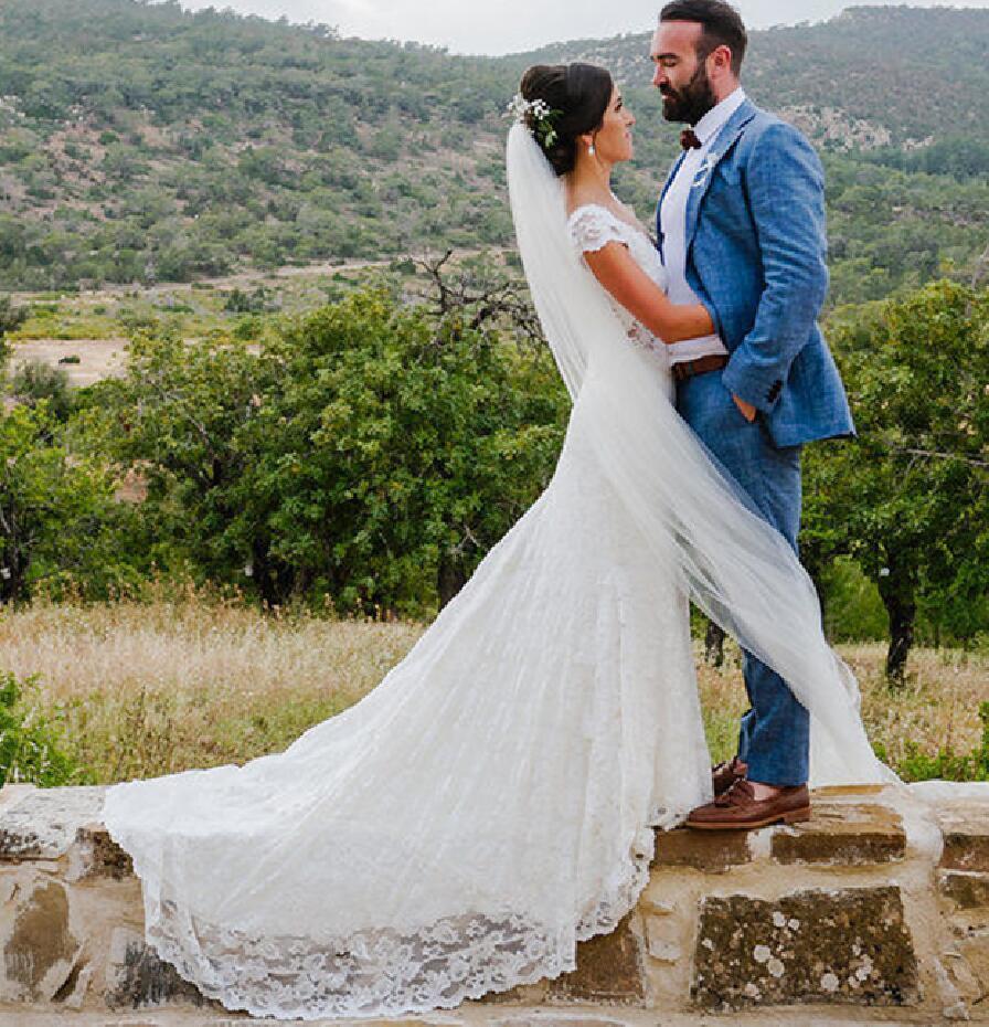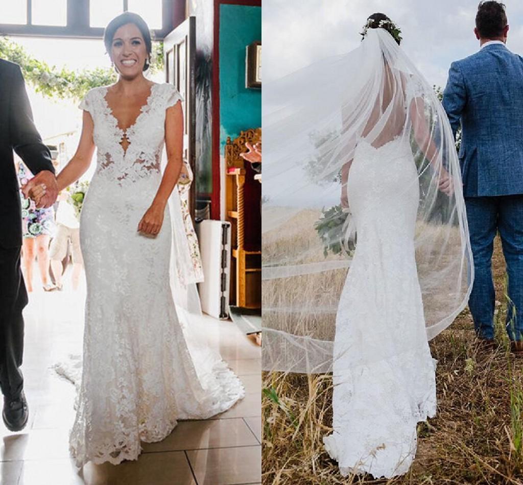 Sexy Deep V-Neck Lace Mermaid Wedding Dresses Long Backless Tulle Bride Gowns for Womens Capped Sleeves White Bohemian Wedding Dress
