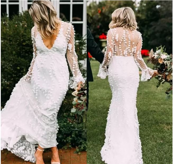 Delicate Lace Bohemian Mermaid Wedding Dresses V Neck Long Sleeve Sweep Train Covered Button Beach Garden Wedding Gowns