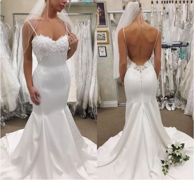 Glossy Simple Satin Mermaid Wedding Gowns Sexy Open Back Spaghetti Straps Arabic Aso Ebi Bridal Dress