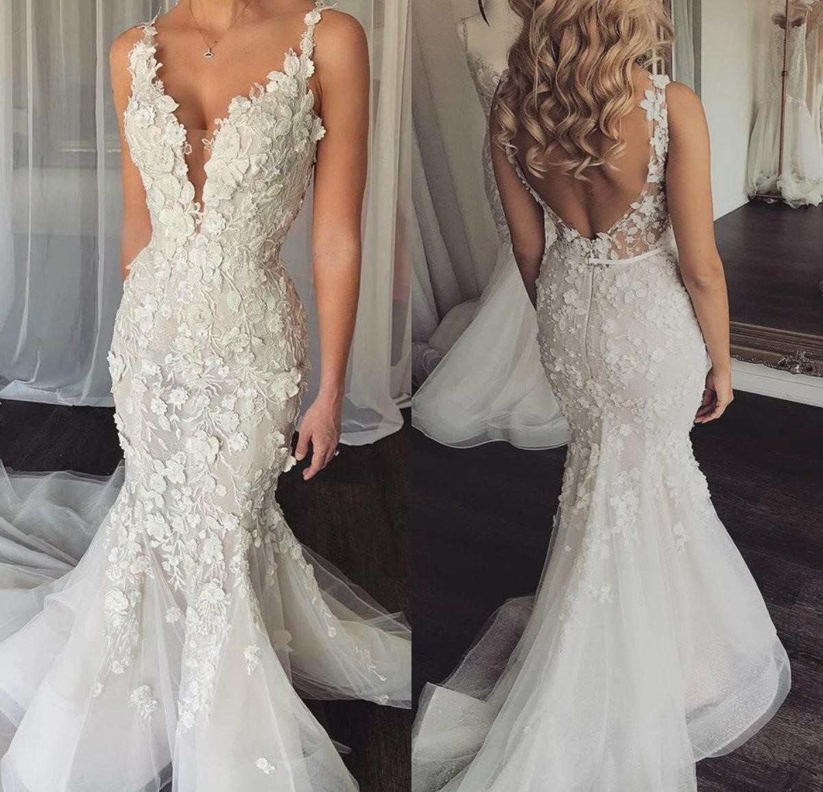 Wedding Dresses Lace 3D-Floral Appliques Deep V Neck Sleeveless Bohemian Mermaid Bridal Gowns Sexy Backless Boho Wedding Dress