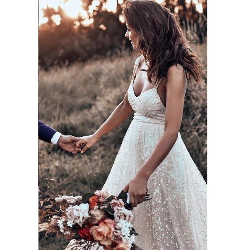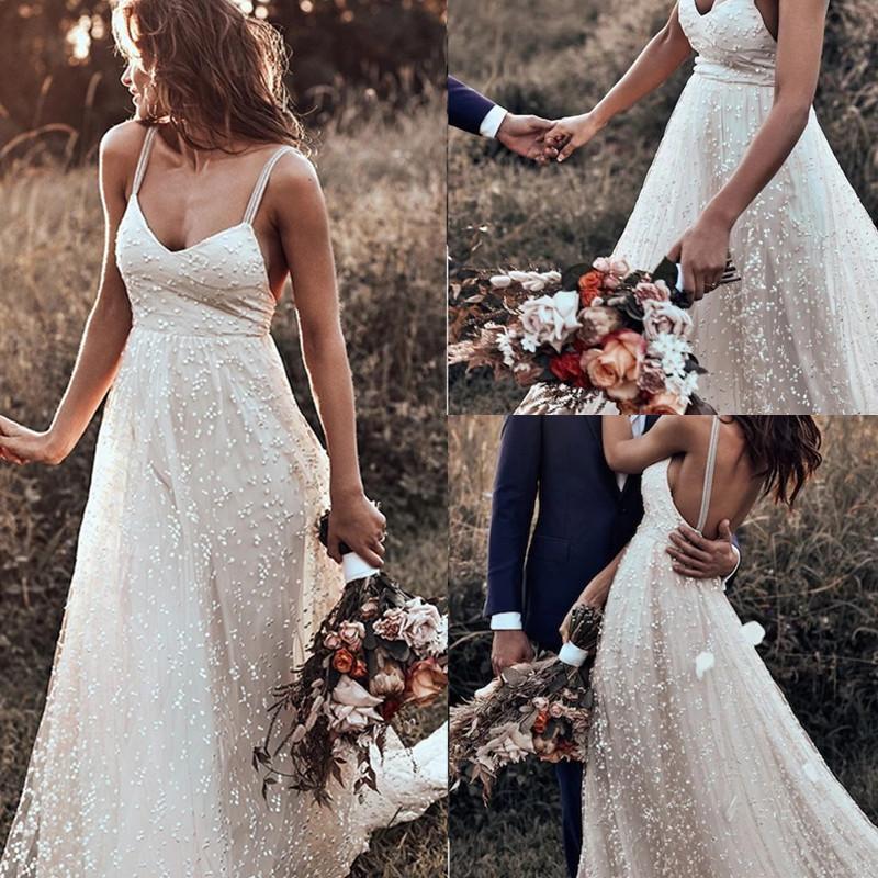 Bohemian Wedding Dresses V Neck Long Sleeveless Lace Sweep Train Beach Boho Garden Country Bridal Gowns