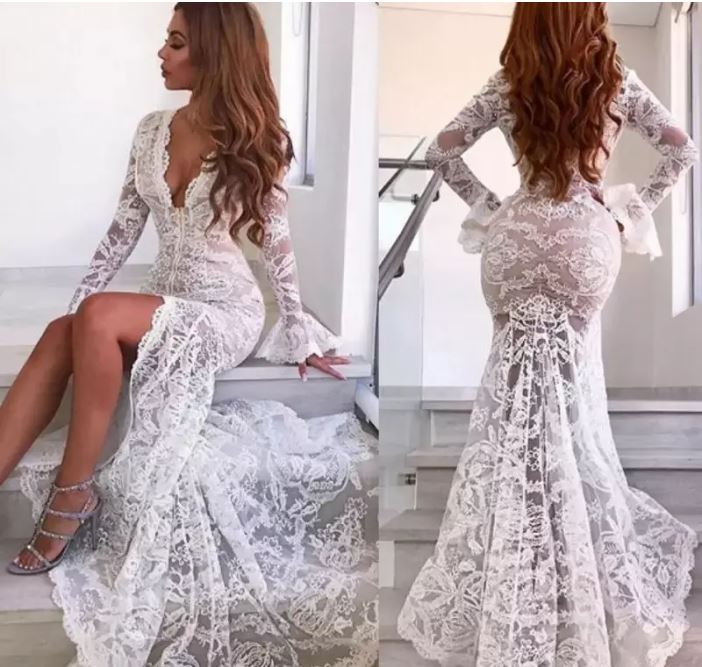 Sexy Deep V Neck Mermaid Wedding Dress Long Sleeve Slit Bohemian Bridal Gown abiti da sposa Lace Plus Size Wedding Dress