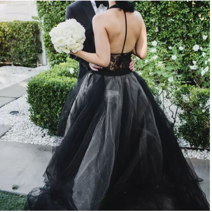 Gothic Black And Beige A Line Wedding Dresses Bridal Gowns Lace Appliques Halter Backless Bride Dress