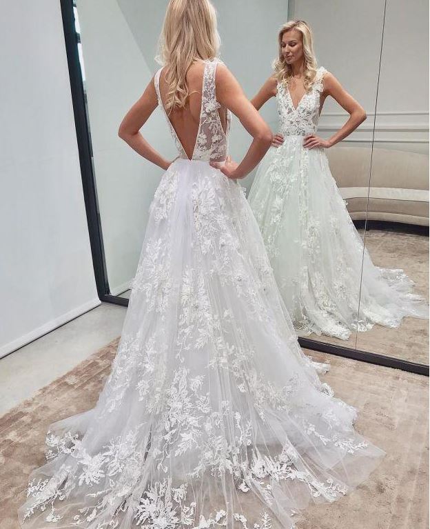 New Sexy A Line Wedding Dresses White Lace Appliqued Deep V Neck Backless Beach Wedding Dress Cheap Boho Bridal Gowns