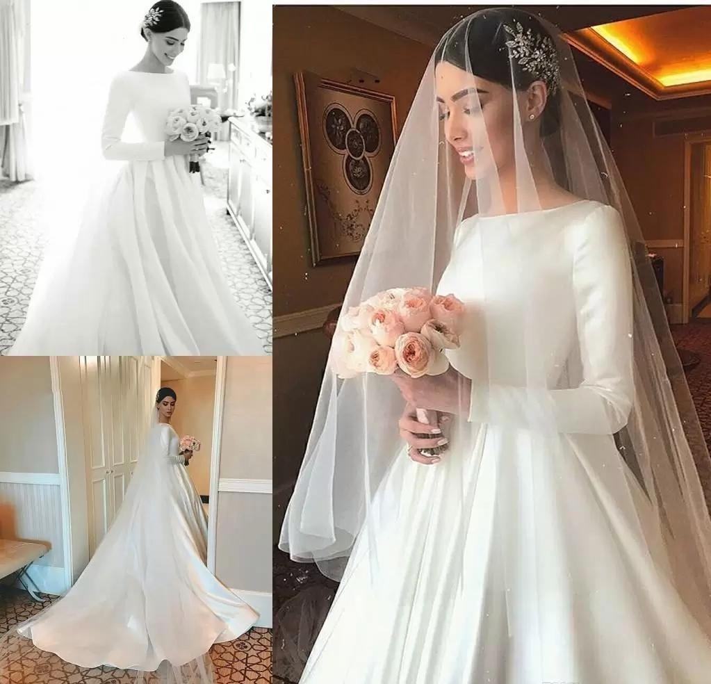 Vintage A Line Wedding Dresses Ivory Bridal Dress Long Sleeves Bateau Satin Backless Party Gowns