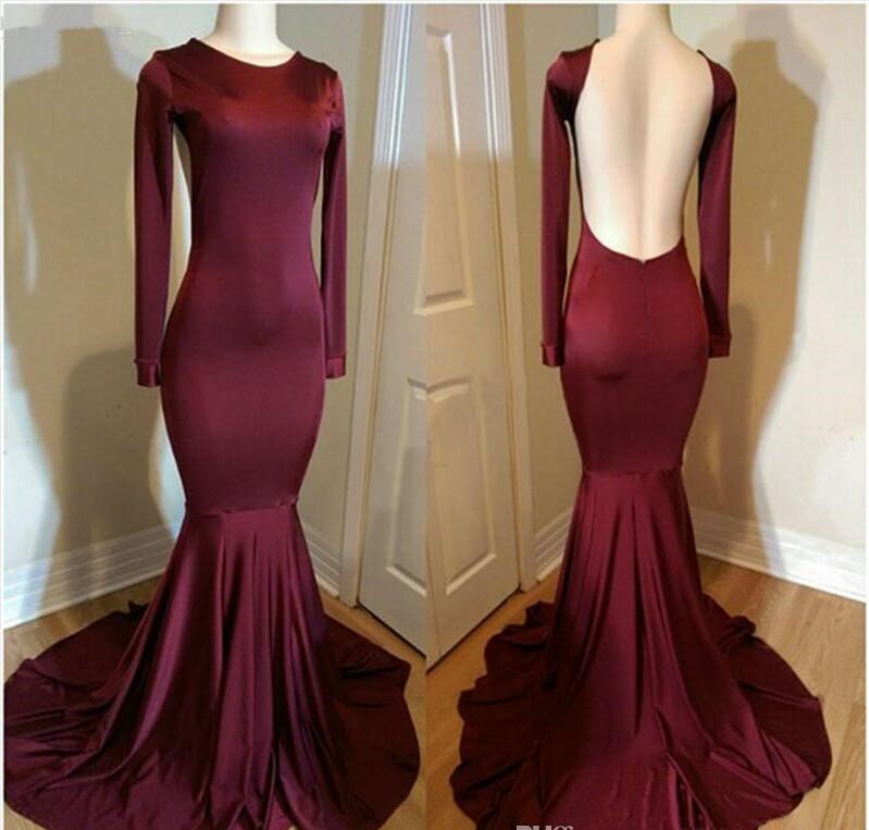 Vintage Burgundy Long Sleeves Prom Dresses Mermaid Sexy Backless Evening Dress Ruched Sweep Train Formal Celebrity Party Dresses