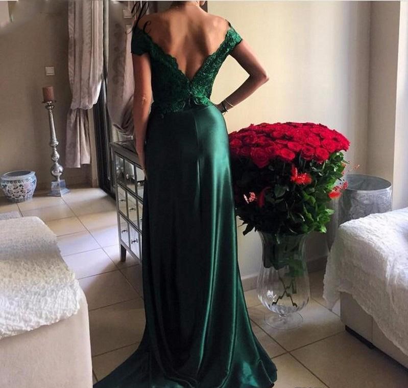 Off Shoulder Emerald Green Evening Dresses Dubai Lace Formal Sexy Split Evening Gowns Party Dress Open Back Prom Dresses