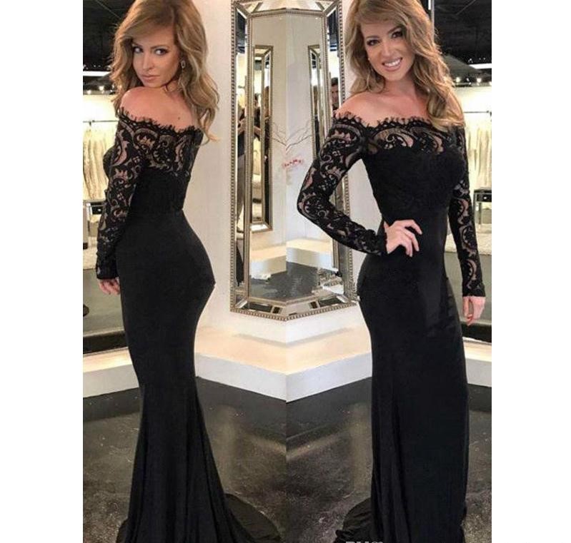 New Vintage Black Lace Formal Celebrity Evening Dresses With Long Sleeves Off Shoulder Special Occasion Party Prom Gowns