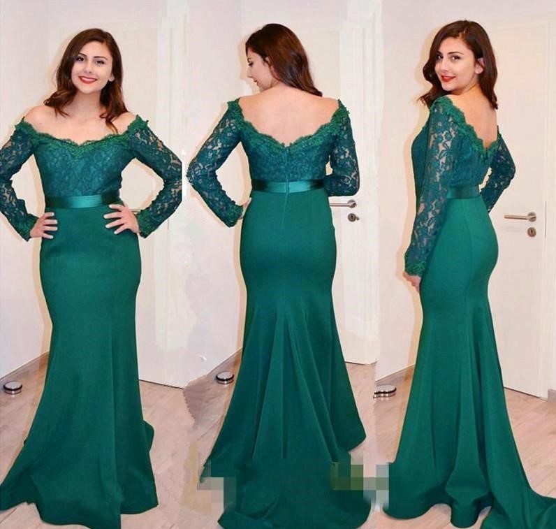 Dark Green Bateau Lace Long Sleeve Mermaid Evening Dress With Slim Sash Sexy Open Back Sweep Train Prom Party Gown
