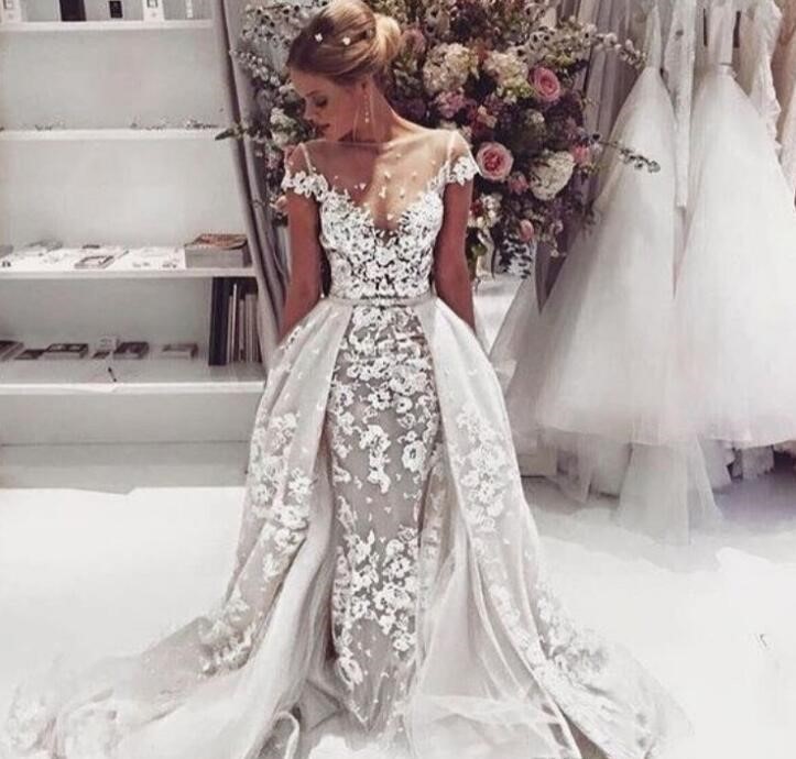 Luxury Lace Appliques Wedding Dresses Bridal Gowns with Overskirt Sexy Sheer Bateau Short Sleeves vestidos de novia Custom Made Court Train