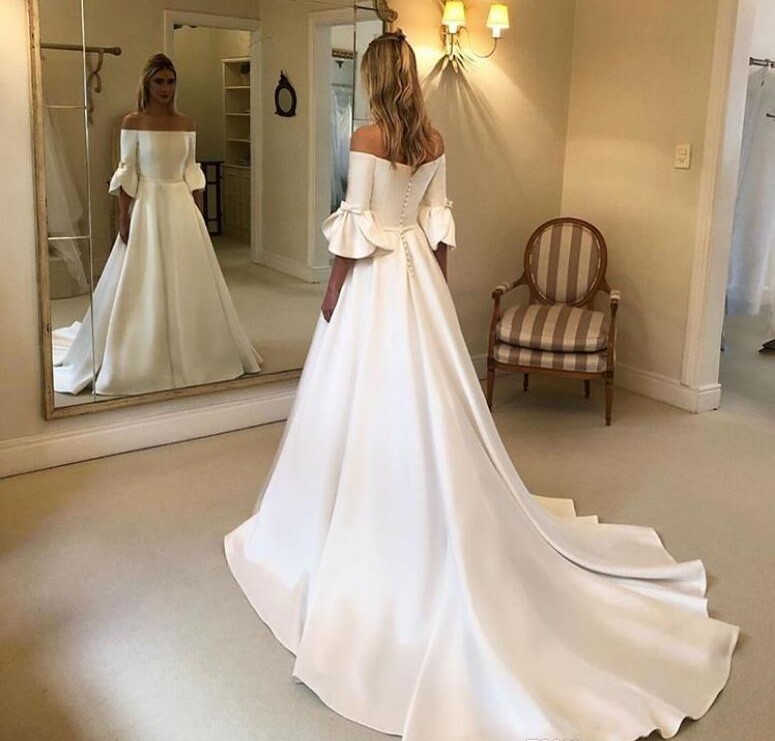 Simple Vintage New Wedding Dresses A Line Off Shoulder Half Sleeves Satin With Pocket Plus Size Long Button Back Formal Bridal Gowns