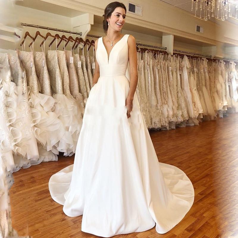 Sexy Deep V-Neck Wedding Dresses Satin Custom Made Sleeveless A-Line Long Dress for Marriage Bridal Gown