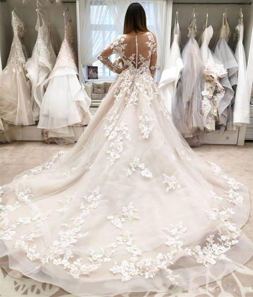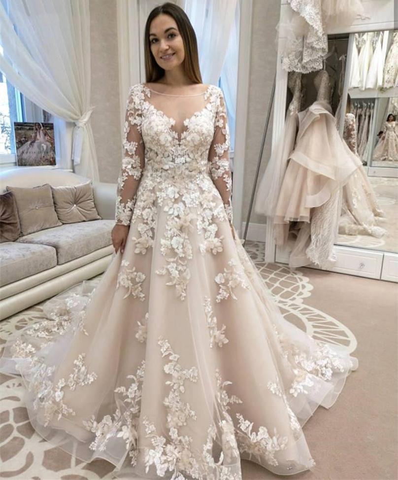 Scoop Neck Long Sleeves Lace Wedding Dresses with Flowers Appliques Court Train Tulle Plus Size Bridal Gowns