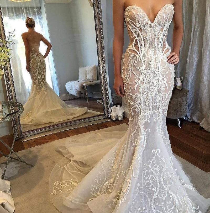Newest Mermaid Wedding Dresses Sweetheart Neck Lace Applique Sexy Bridal Gowns Sweep Train Custom Made Wedding Dress
