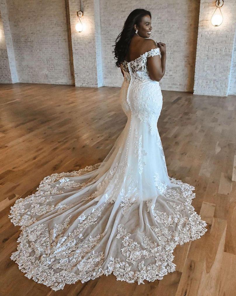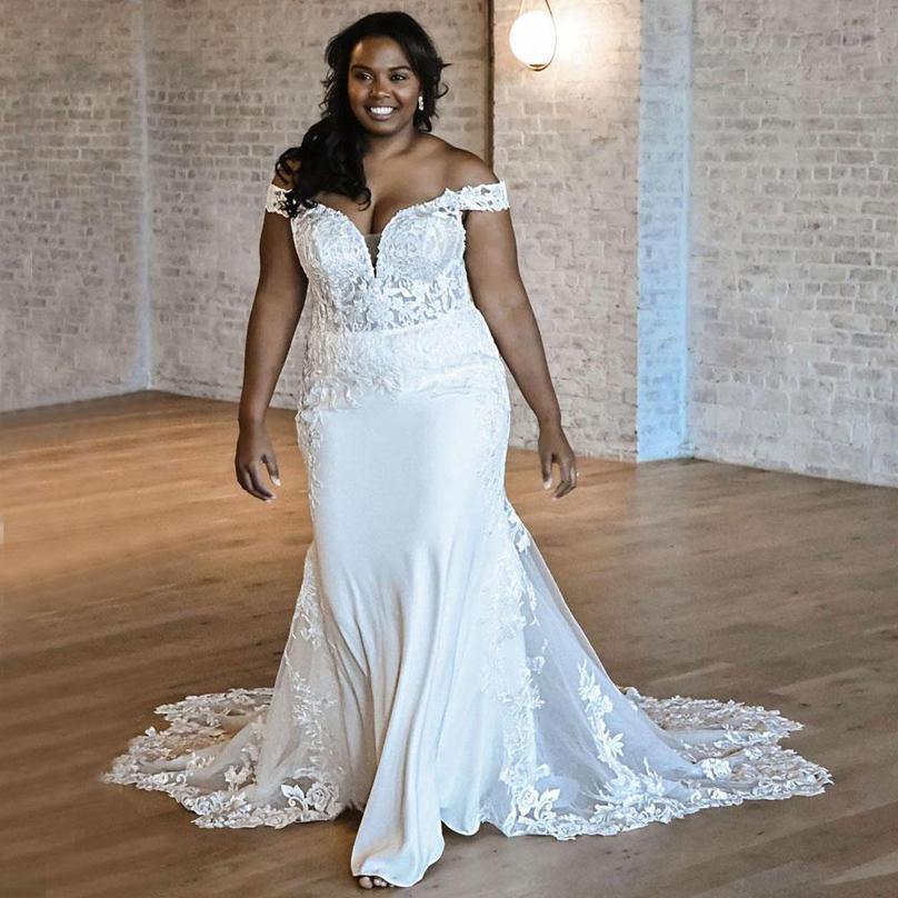 Off the Shoulder Plus Size Lace Mermaid Wedding Dresses Bridal Gowns Court Train Appliqued Short Sleeves Bride Dress
