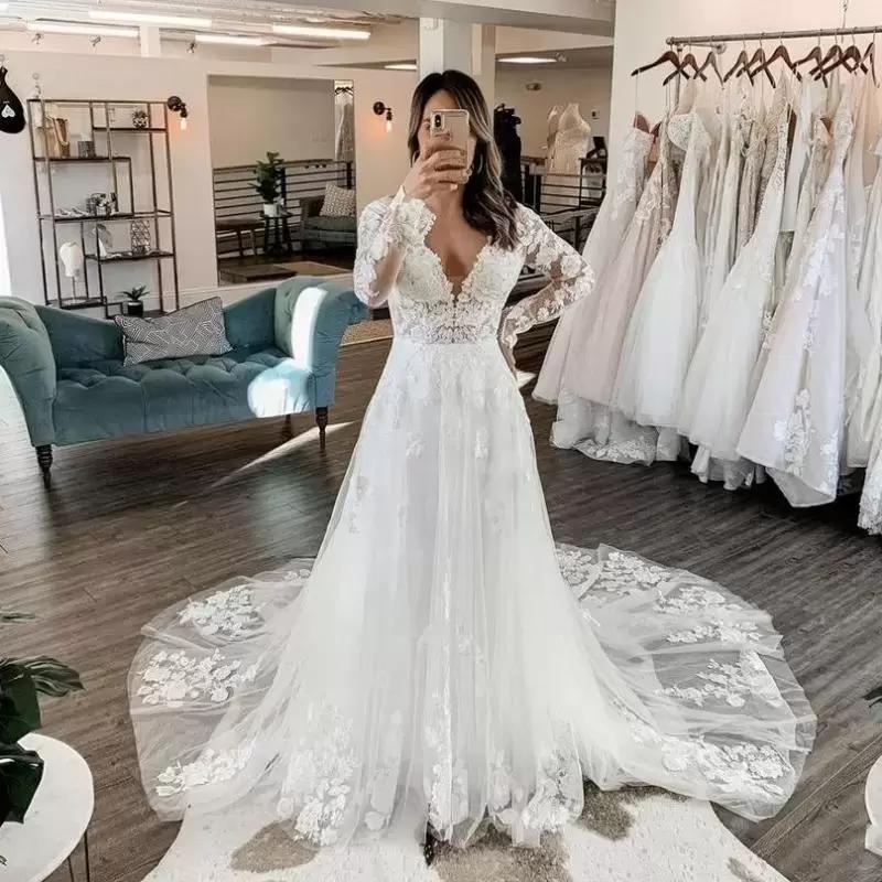 Full Lace Wedding Dress Vintage Long Sleeves Bridal Gowns Appliqued V Neck Zip Back Sweep Train Modest vestidos de novia Dresses