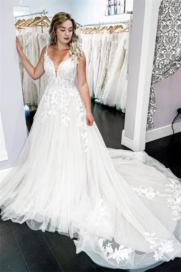 A-line Lace Appliques Tulle Wedding Dresses Spaghetti V Neck Sweep Train Garden Bridal Gowns